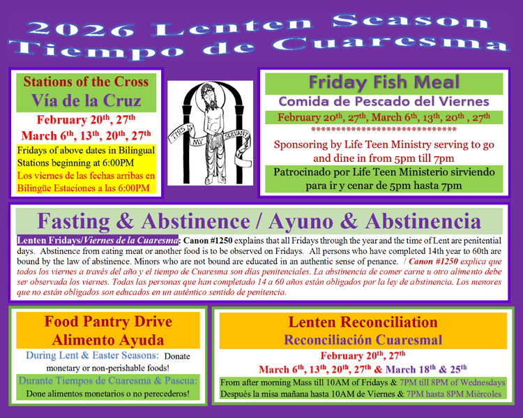 - Friday Fish Meal sponsoring by Life Teen Ministry from 5PM till 7PM to go or dine in